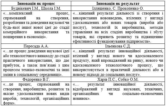 Аналіз наукової літератури також свідчить про два основні підходи, щодо визначення поняття «інновація»: динамічний, який розглядає інновацію, як процес внесення певних змін та статичний, відповідно до якого інновація є кінцевим результатом інноваційної діяльності (табл. 1).