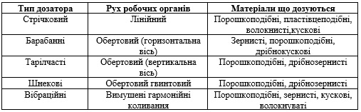 Характеристика дозаторів безперервної дії [2,4] наведена в таблиці 1 .