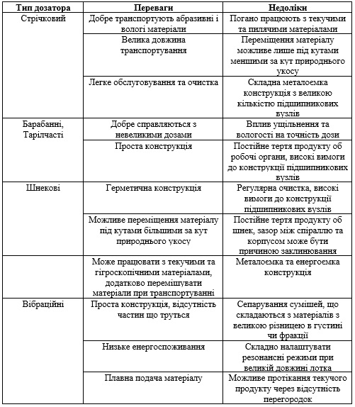 Аналізуючи таблицю 1 можна зробити висновок, що стрічкові дозатори є найбільш універсальними, проте варто врахувати особливості середовища та матеріалів а також конструктивні особливості дозаторів.