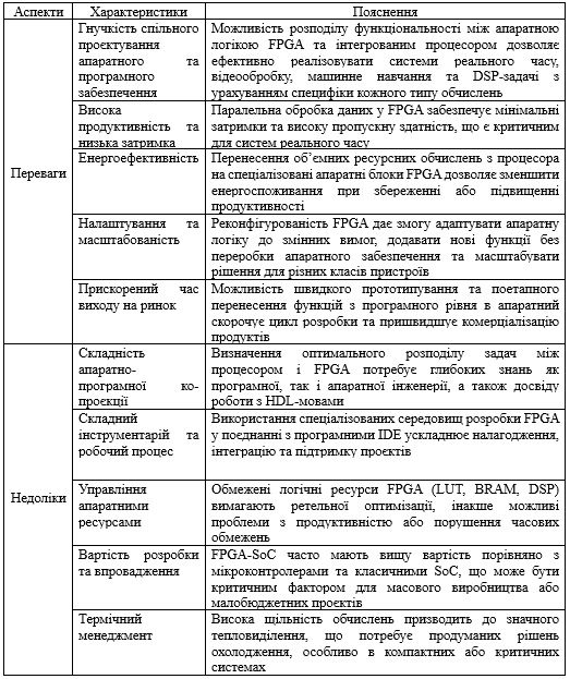 Розглянемо табл. 1, в якій будуть наведені переваги та недоліки проєктування SoC в поєднанні з FPGA.
