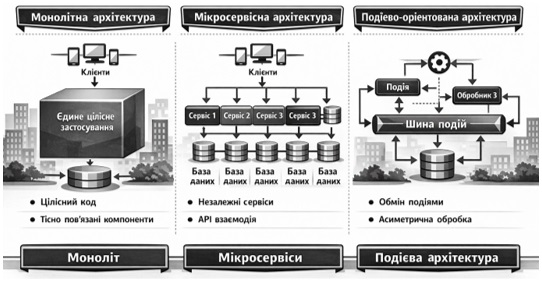 Результати дослідження. В межах дослідження розглянуто основні архітектурні стилі, що застосовуються в СРЧ, узагальнено їхні структурні характеристики, сильні сторони та обмеження. На рисунку 1 наведено узагальнену схему архітектурних стилів для систем реального часу, яка ілюструє принципи побудови монолітної, мікросервісної та подієво-орієнтованої архітектур і дозволяє наочно порівняти підходи до організації компонентів та їх взаємодії [1, 4].