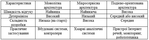 Для узагальнення особливостей розглянутих підходів у табл. 1 наведено порівняльну характеристику архітектурних стилів, що дозволяє оцінити їхні переваги та недоліки з точки зору застосування у конкретних СРЧ.