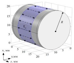 Моделювання процесу поширення поперечних хвиль по перерізу циліндра в тривимірної постановці представлено рис.2. Фахівці вважають, що збудження ультразвукових хвиль відбувається за рахунок застосування імпульсу дотичних напружень τ(t), які поступово розподілені по периметру циліндричного металовиробу.