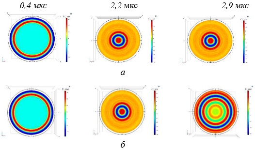 Результати чисельного моделювання процесу поширення поперечної ультразвукової хвилі, що збуджується прохідним ЕМАП наведено на рис.3. Дані показані для фронту ультразвукової хвилі в площині X0Y (а) і в площині Y0Z (б) у різні моменти часу для прутка діаметром 10 мм на частоті 2 МГц.