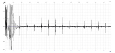 Рис. 5. Часова розгортка перевидбиттів ультразвукових зсувних радіальних хвиль від торців зразка при використанні ЕМАП в суміщеному режимі
