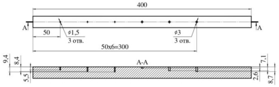 З метою отримання вибірки інформативних параметрів ДТМ багаторазових відображень виготовлені зразки з сталей 03Х14Н7Б і 38ХГМ з різною ефективністю ЕМА перетворення з виготовленими в них моделями дефектів у вигляді плоскодонних свердлінь радіальних напрямків різних діаметрів та різною глибиною, рис. 6.