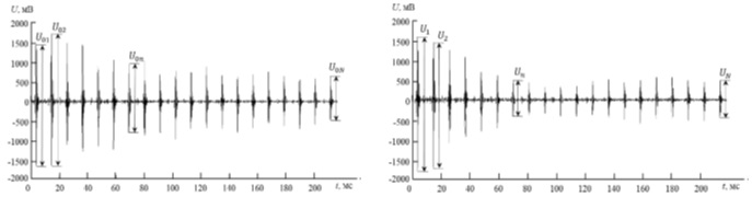 В результаті експериментальних досліджень отримані часові розгортки, один з прикладів яких наведено на рис. 7 [2]. На рисю 7а наведено часову розгортку при відсутності в зразку стрижня моделі дефекту. На рис. 7 б наведено часову розгортку при наявності в зразку стрижня моделі дефекту діаметром 1,5 мм з глибиною свердління 8,4 мм. Аналіз отриманих даних дає можливість зробити висновок, що наявність в прутку дефекту приводить до суттєвого зменшення амплітуди U1… Un в послідовності перевідбиттів ультразвукових імпульсів по діаметру циліндричного виробу. Очевидно, що величина амплітуди прийнятих ультразвукових імпульсів може бути бракувальним критерієм.