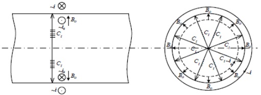 На рис.1 наведено: B0-індукція поляризуючого магнітного поля; ~і – сила струму в високочастотній котушці ЕМАП; ~ів – сила вихрового струму в поверхневому шарі металовиробу, яка збуджена струмом ~і; Сt - ультразвукові зсувні хвилі радіальних напрямків.