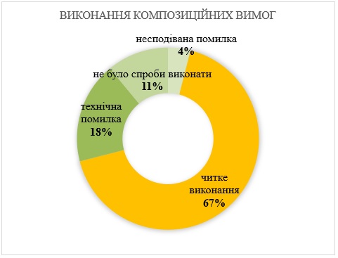 Як показано на рисунку 1, якщо взяти загальну кількість невиконаних «композиційних вимог», то це складає 33%, тобто чверть виконання. З яких 4% «несподівана помилка», те на що не очікували ні тренер, ні гімнастка (коли було падіння – «відрив» від брусів або «промазали» на колоді), 18% «технічне виконання» − коли неможливо зарахувати композиційну вимогу за технічними показниками, і 11% − «не було спроби» виконати композиційну вимогу, все це свідчить про недосконалість підготовки спортсменок.