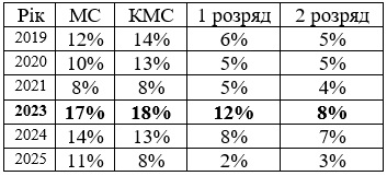 Також наше дослідження виявило, що до 2023 року цей показник знижувався, тому що жіночий технічний комітет кожного року аналізує і, якщо потрібно перепрацьовує кваліфікаційні програми КМС, 1 та 2 розряду. Але у 2022 році в Україні розпочалась війна і багато дівчат поїхали з країни, а в цей час в Україні не проводилися жодні змагання. З даних таблиці ми бачимо, що у 2023 році були дуже погані показники. Такий спад обумовлений тим що, якщо і залишалися тренери і спортсмени в Україні, то вони не завжди могли тренуватися (як і сьогодні). Загалом після 2023 року показники по трохи почали покращуватися.