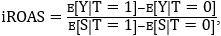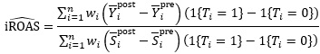In the fraction above,  are pre and post means for outcome Y in region  are the corresponding means for spend S, and w i are nonnegative weights that implement trimming or augmented adjustments.
