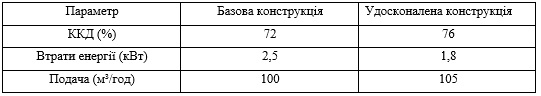 Результати моделювання показали, що покращення прохідного перерізу шляхом зміни кута нахилу лопаті на 5° та оптимізації форми спірального корпусу зменшує турбулентні втрати на 15%. ККД становив 72% для базової конструкції та 75–77% після узгодження компонентів у номінальному режимі.