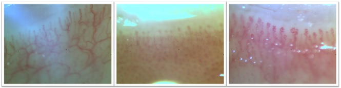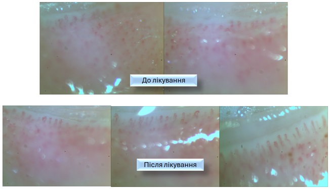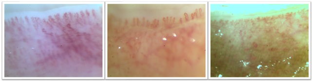 На представлених зображеннях відображено різні ступені розладу кровонаповнення та кровоплину в класичних капілярах та в структурно змінених капілярах поверхневих та глибоких шарів мікроциркуляторного русла. Слід наголосити, що перші ознаки мікроциркуляторних змін можуть випереджувати лабораторні верифікації на півроку-рік.