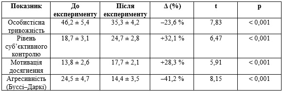 Зокрема, рівень особистісної тривожності знизився на 23,6 % (p < 0,001), показник РСК зріс на 32,1 % (p < 0,01), а мотивація досягнення збільшилася на 28,3 %. Крім того, спостерігалося достовірне зниження агресивних реакцій у стресових ситуаціях (на 41,2 %).