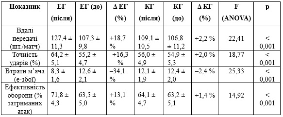 Дані психологічні зрушення безпосередньо трансформувалися в покращення ігрових показників: зросла кількість вдалих передач, точність ударів, ефективність оборони та, що особливо важливо, зменшилася кількість втрат м’яча через емоційні збої. На противагу цьому, у контрольній групі, де психологічна підтримка не застосовувалася, зміни були незначними та статистично недостовірними, що підтверджує специфічний вплив саме психологічної інтервенції.